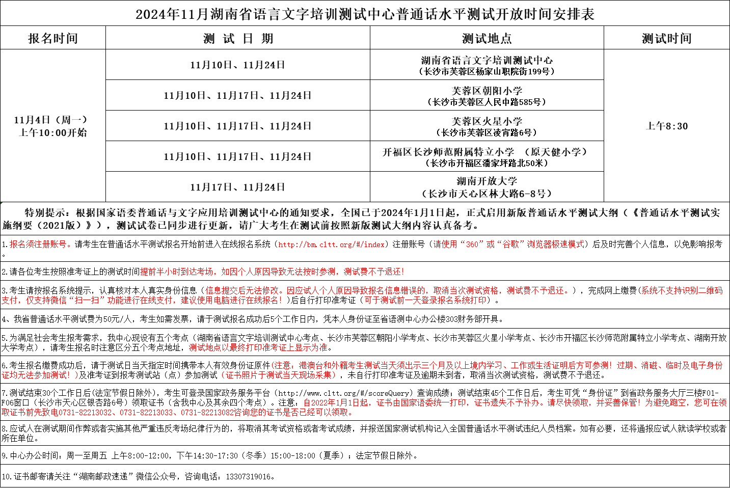 2024年11月湖南省语言文字培训测试中心普通话水平测试开放时间安排表