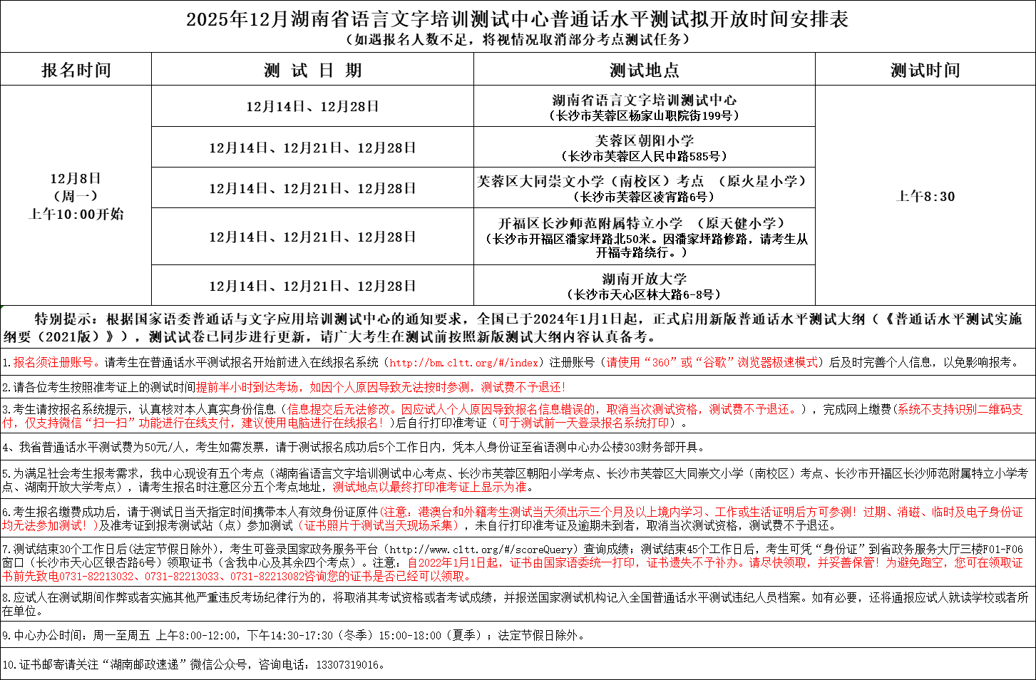 2025年12月湖南省语言文字培训测试中心普通话水平测试拟开放时间安排表